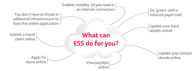 Employee Self Service (ESS) is a web-based self-service tool enabling employees to manage and maintain their own information online, without unnecessary paperwork. With many organisations going ‘green’, ESS provides the perfect ‘paperless’ solution.